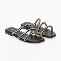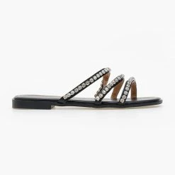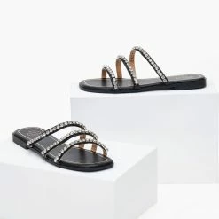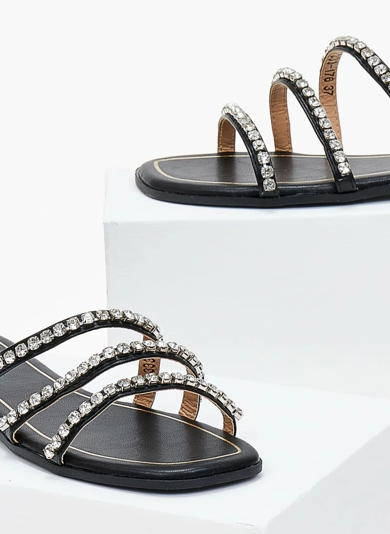 Σανδάλια φλατ σε καρέ γραμμή. Έχουν τρία λουράκια στο κουτεπιέ τα οποία είναι στολισμένα με strass.