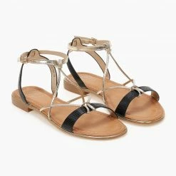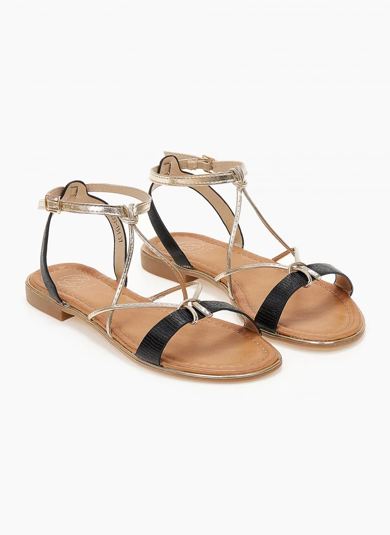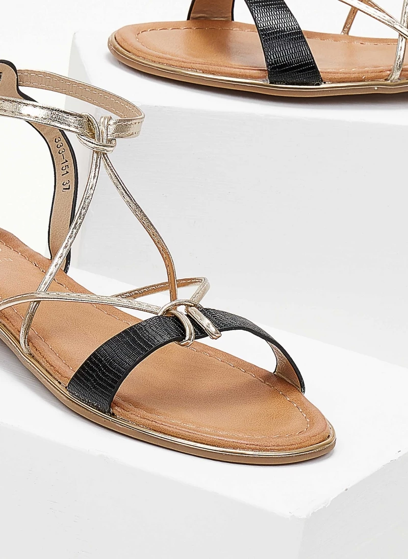 Σανδάλια με δέσιμο στο πλάι. Έχουν λεπτά χιαστί λουράκια στo κουτεπιέ και φάσα σε μεταλλικές αποχρώσεις. Μεταλλική λεπτομέρεια σε χρυσό χρώμα περιμετρικά της σόλας.