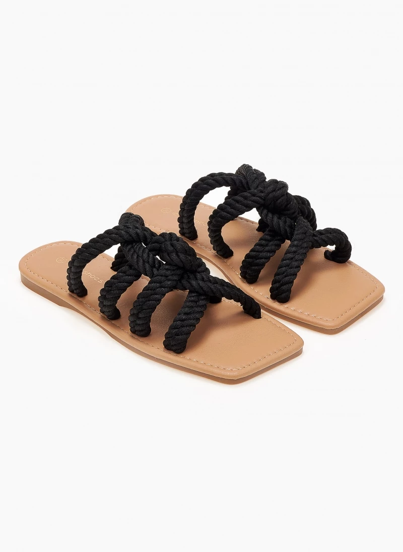 Σανδάλια φλατ σε καρέ γραμμή.Έχουν σχέδιο πλεγμένα σχοίνινα λουράκια.