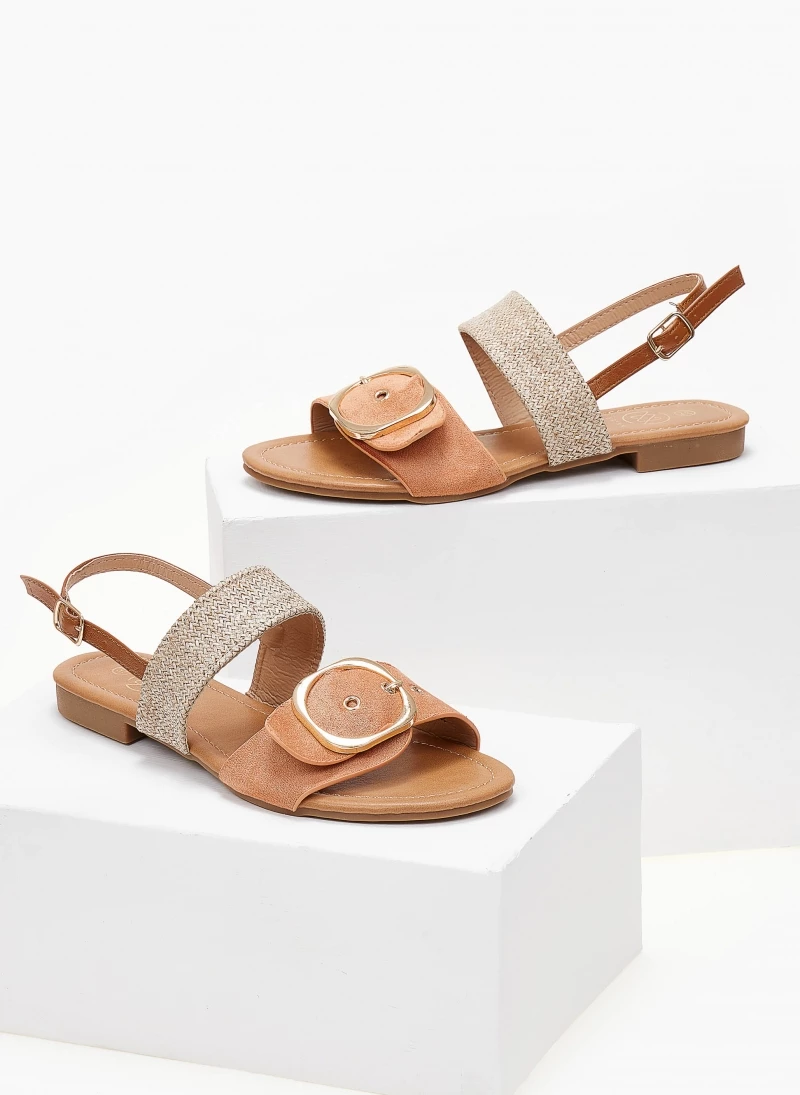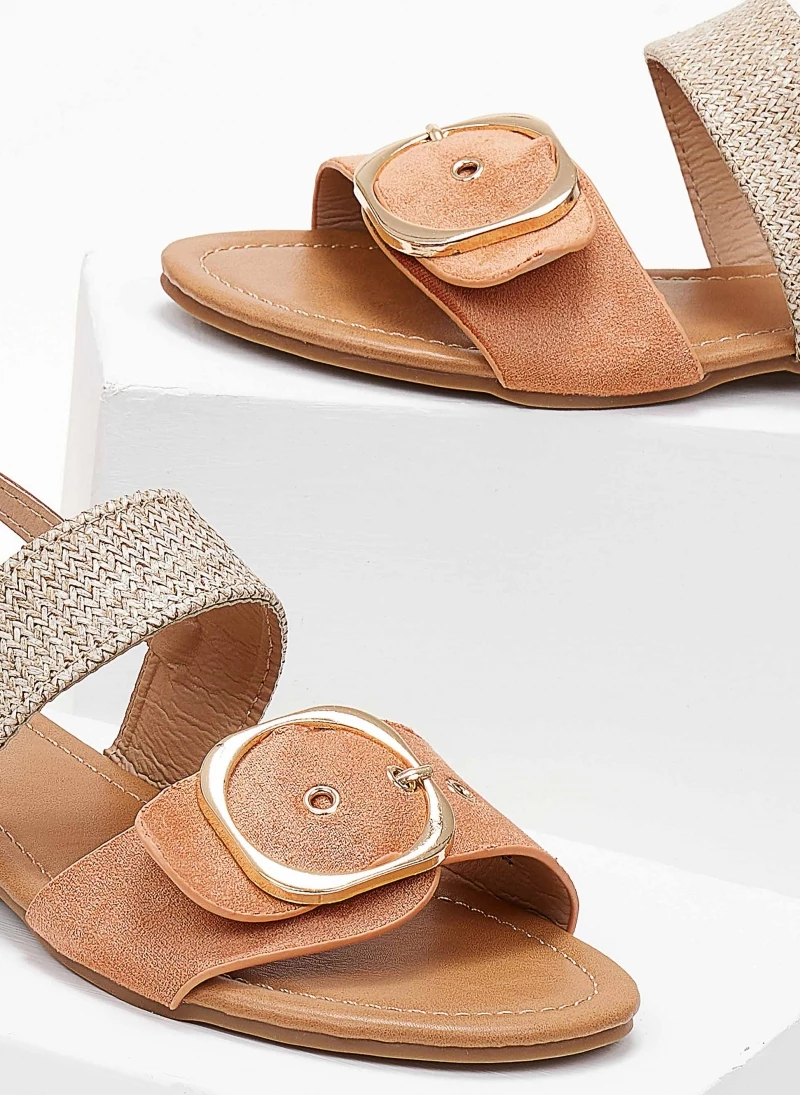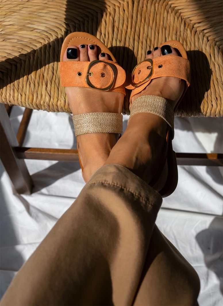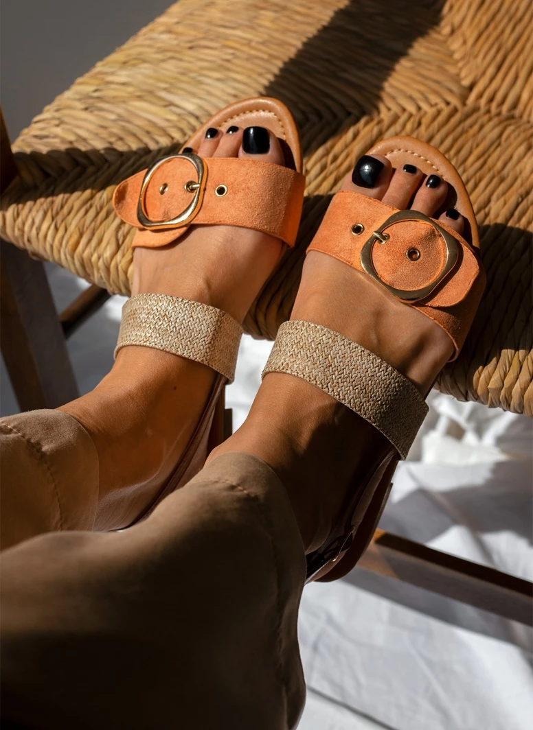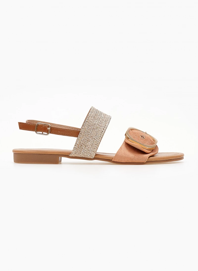 Πέδιλα σανδάλια με ψάθινη λεπτομέρεια. Έχουν suede φαρδιά φάσα με μεγάλη μεταλλική αγκράφα. Δένουν στο πλάι με λουράκι.