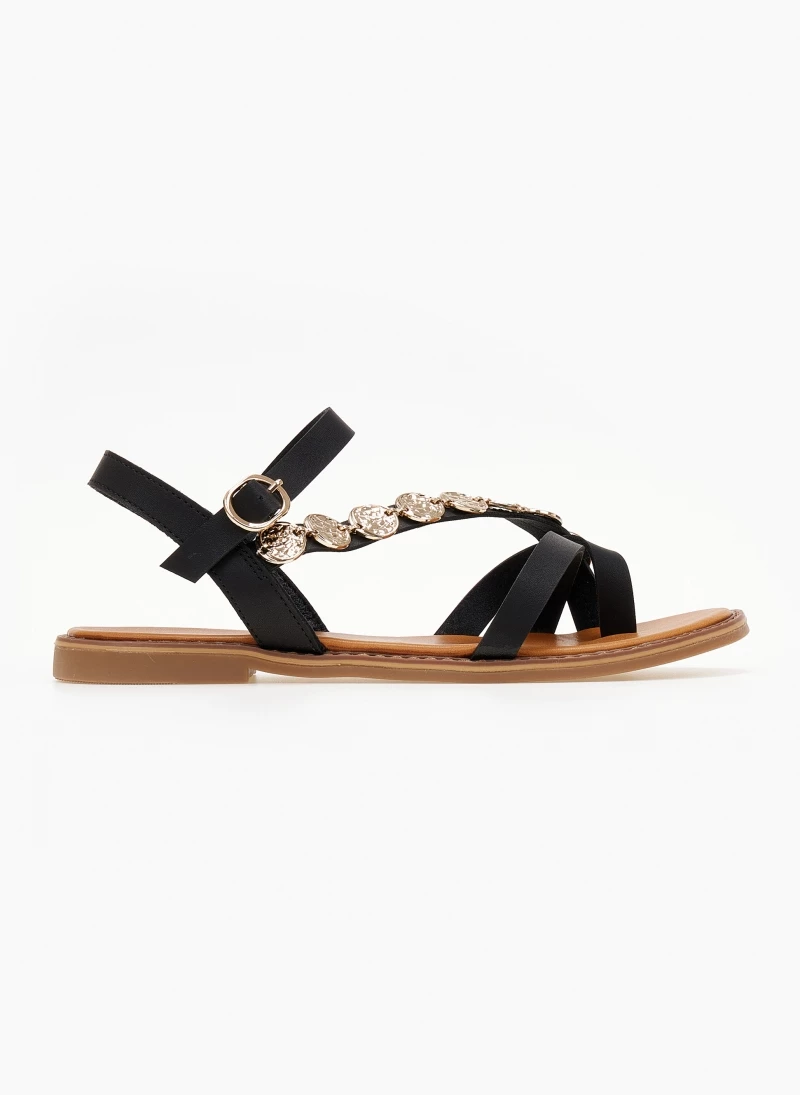Σανδάλια με στρογγυλά μεταλλικά στοιχεία και λοξό λουράκι. Έχουν σόλα από λάστιχο.